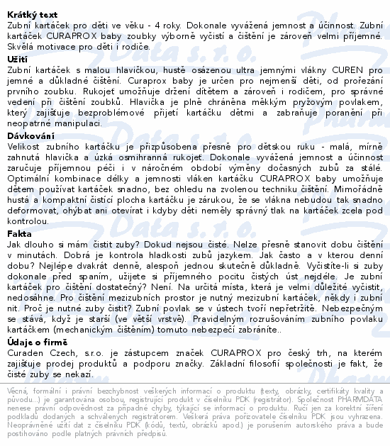 Zubní kartáček pro děti ve věku 0 - 4 roky. Dokonale vyvážená jemnost a účinnost. Zubní kartáček CURAPROX baby zoubky výborně vyčistí a čištění je zároveň velmi příjemné. Skvělá motivace pro děti i rodiče.