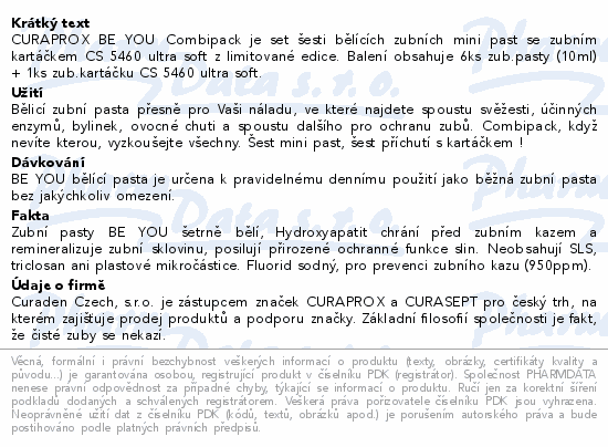 CURAPROX BE YOU Combipack je set šesti bělících zubních mini past se zubním kartáčkem CS 5460 ultra soft z limitované edice. Balení obsahuje 6ks zub.pasty (10ml) + 1ks zub.kartáčku CS 5460 ultra soft.