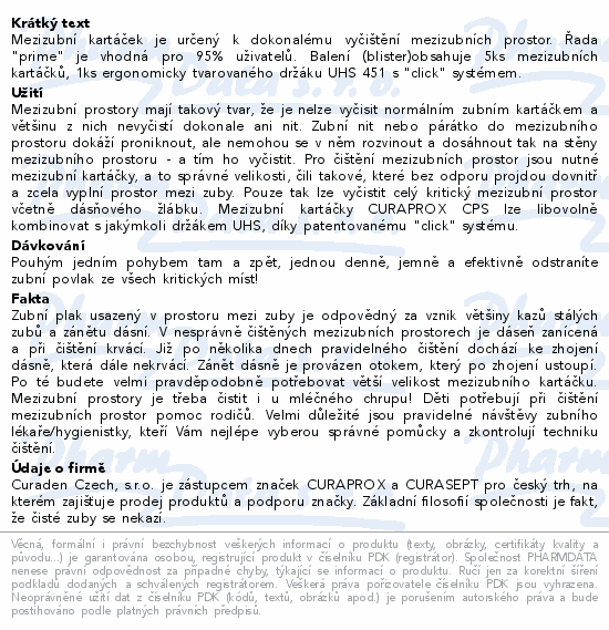 Mezizubní kartáček je určený k dokonalému vyčištění mezizubních prostor. Řada "prime" je vhodná pro 95% uživatelů. Balení (blister)obsahuje 5ks mezizubních kartáčků, 1ks ergonomicky tvarovaného držáku UHS 451 s "click" systémem.