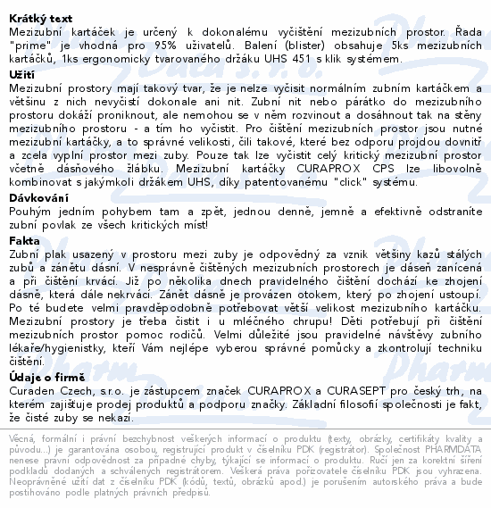 Mezizubní kartáček je určený k dokonalému vyčištění mezizubních prostor. Řada "prime" je vhodná pro 95% uživatelů. Balení (blister) obsahuje 5ks mezizubních kartáčků, 1ks ergonomicky tvarovaného držáku UHS 451 s klik systémem.