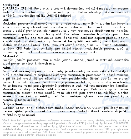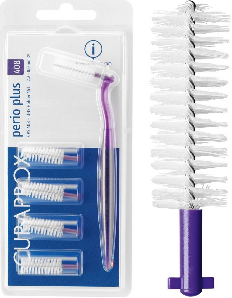 CURAPROX CPS 408 Perio plus je určený k dokonalému vyčištění mezizubních prostor. Řada perio velikostně navazuje na řadu prime. Balení obsahuje 5ks mezizubních kartáčků, 1ks úhlového držáku UHS 451 (blister).