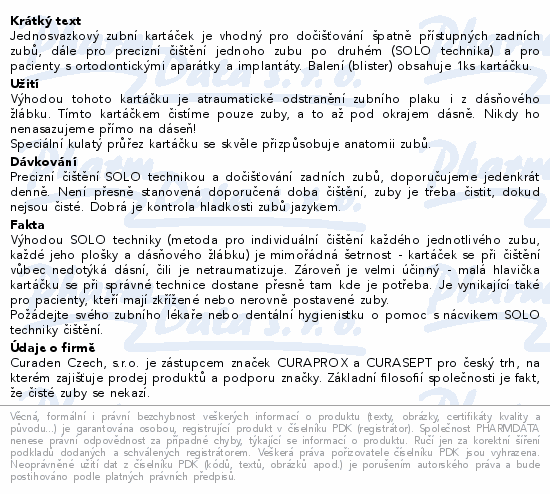 Jednosvazkový zubní kartáček je vhodný pro dočišťování špatně přístupných zadních zubů, dále pro precizní čištění jednoho zubu po druhém (SOLO technika) a pro pacienty s ortodontickými aparátky a implantáty. Balení (blister) obsahuje 1ks kartáčku.