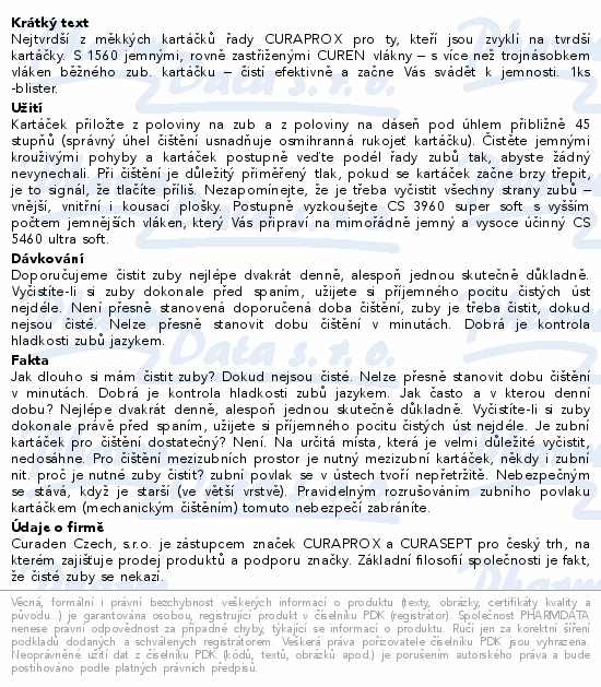 Nejtvrdší z měkkých kartáčků řady CURAPROX pro ty, kteří jsou zvyklí na tvrdší kartáčky. S 1560 jemnými, rovně zastřiženými CUREN vlákny – s více než trojnásobkem vláken běžného zub. kartáčku – čistí efektivně a začne Vás svádět k jemnosti. 1ks -blister.