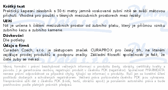 Praktický kapesní zásobník s 50-ti metry jemně voskované zubní nitě se svěží mátovou příchutí. Vhodná pro použití v těsných mezizubních prostorech mezi řezáky.