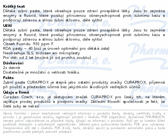Dětská zubní pasta, která obsahuje pouze zdraví prospěšné látky. Jsou to zejména enzymy a fluorid, které posilují přirozenou obranyschopnost proti zubnímu kazu a podporují zdravou a silnou zubní sklovinu, dále xylitol.