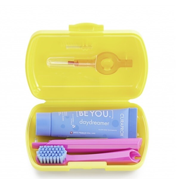 Cestovní sada Travel set obsahuje kompaktní cestovní kartáček na zuby CS 5460, svěží zubní pastu BE YOU 10ml na bělení a dva mezizubní kartáčky s praktickým držákem.