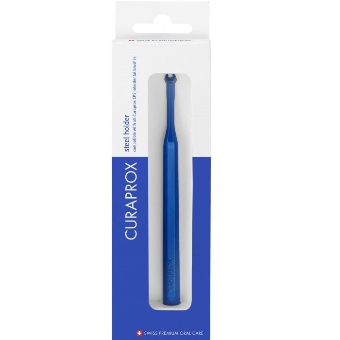 Profesionální držák mezizubních kartáčků, ocelový v barvě modré, který je určen pro bezpečné a praktické čištění mezizubních prostor. Speciálně vhodný pro postranní úsek zubů.