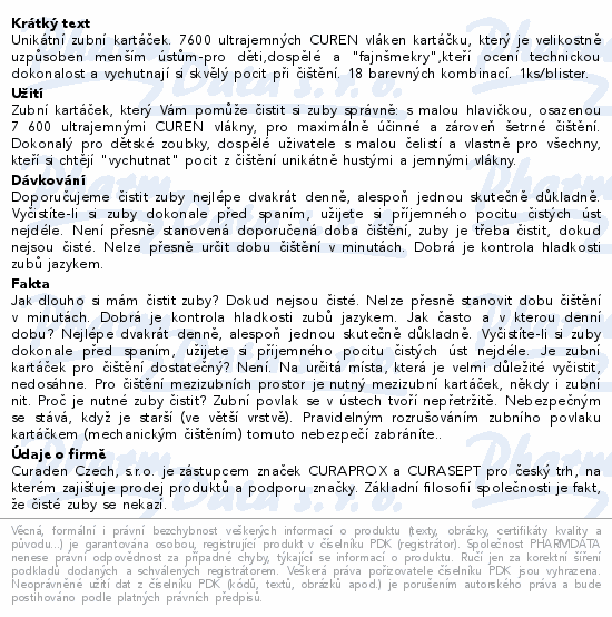 Unikátní zubní kartáček. 7600 ultrajemných CUREN vláken kartáčku, který je velikostně uzpůsoben menším ústům-pro děti,dospělé a "fajnšmekry",kteří ocení technickou dokonalost a vychutnají si skvělý pocit při čištění. 18 barevných kombinací. 1ks/blister.