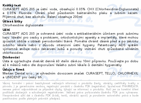 CURASEPT ADS 205 je ústní voda, obsahující 0.05% CHX (Chlorhexidine-Digluconate) a 0.05% Fluoride. Chrání před působením bakteriálního plaku a zubním kazem. Příjemná chuť, bez alkoholu. Balení obsahuje 200ml.