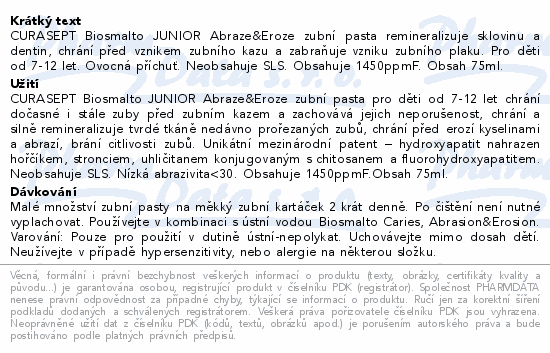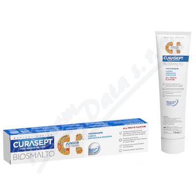 CURASEPT Biosmalto JUNIOR Abraze&Eroze zubní pasta remineralizuje sklovinu a dentin, chrání před vznikem zubního kazu a zabraňuje vzniku zubního plaku. Pro děti od 7-12 let. Ovocná příchuť. Neobsahuje SLS. Obsahuje 1450ppmF. Obsah 75ml.