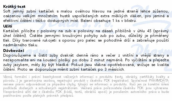 Soft jemný zubní kartáček s malou oválnou hlavou na jedné straně lehce zúženou, osázenou velkým množstvím hustě uspořádaných extra měkkých vláken, pro jemné a efektivní čištění i těžko dostupných míst. Balení obsahuje 1 ks v blistru.
