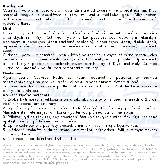Cutimed Hydro L je hydrokoloidní krytí. Zajišťuje udržování vlhkého prostředí ran. Krycí materiál reaguje s exsudátem z rány za vzniku měkkého gelu. Díky složení hydrokoloidního materiálu je zajištěno minimální nebo nulové poškození nově vytvořené tkáně.