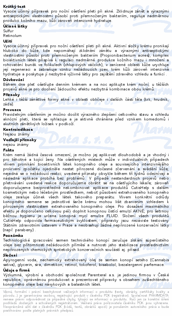 Vysoce účinný přípravek pro noční ošetření pleti při akné. Zklidnuje zánět a výraznými antiseptickými vlastnostmi působí proti přemnoženým bakteriím, reguluje nadměrnou produkci kožního mazu, kůži zároveň intenzivně hydratuje.