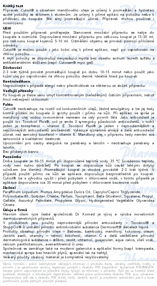 Přípravek Cutoil® s obsahem mandlového oleje je určený k promaštění a hydrataci suché pokožky se sklonem k ekzémům. Je určený k přímé apikaci na pokožku nebo k přidávání do koupele. Má silný promašťující účinek. Přípravek mohou používat i novorozenci.