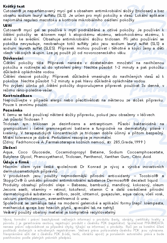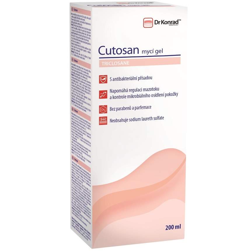 Cutosan® je neparfémovaný mycí gel s obsahem antimikrobiální složky (triclosan) a bez obsahu sodium lauryl sulfátu (SLS). Je určen pro mytí pokožky a vlasů. Lokální aplikace napomáhá regulaci mazotoku a kontrole mikrobiálního osídlení pokožky.