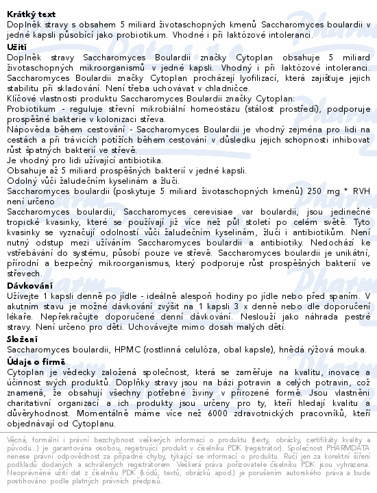 Doplněk stravy s obsahem 5 miliard životaschopných kmenů Saccharomyces boulardii v jedné kapsli působící jako probiotikum. Vhodné i při laktózové intoleranci.