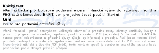 60ml stříkačka pro bolusové podávání enterální klinické výživy do výživových sond a PEG setů s koncovkou ENFIT. Jen pro jednorázové použití. Sterilní.
