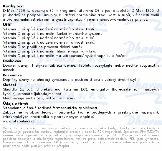 D-Max 1200 IU obsahuje 30 mikrogramů vitamínu D3 v jedné tabletě. D-Max 1200 IU je vhodný na podporu imunity, k udržení normálního stavu kostí a zubů, k činnosti svalů a pro normální vstřebávání a využití vápníku. Příjemná jahodovo-malinová příchuť.