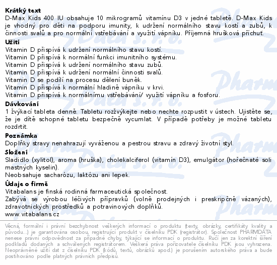 D-Max Kids 400 IU obsahuje 10 mikrogramů vitamínu D3 v jedné tabletě. D-Max Kids je vhodný pro děti na podporu imunity, k udržení normálního stavu kostí a zubů, k činnosti svalů a pro normální vstřebávání a využití vápníku. Příjemná hrušková příchuť.