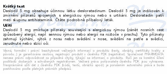 Daslodil 5 mg obsahuje účinnou látku desloratadinum. Daslodil 5 mg je indikován k zmírnění příznaků spojených s alergickou rýmou nebo s urtikárii. Desloratadin patří mezi skupinu antihistaminik. Čtěte pozorně příbalový leták.