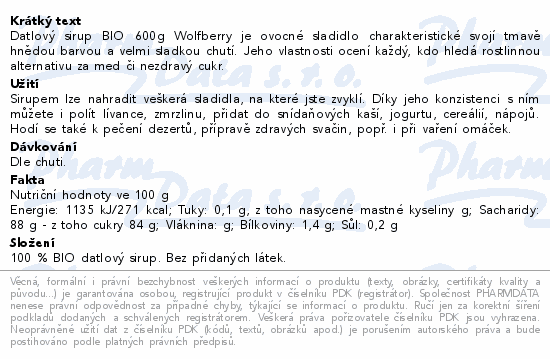 Datlový sirup BIO 600g Wolfberry je ovocné sladidlo charakteristické svojí tmavě hnědou barvou a velmi sladkou chutí. Jeho vlastnosti ocení každý, kdo hledá rostlinnou alternativu za med či nezdravý cukr.