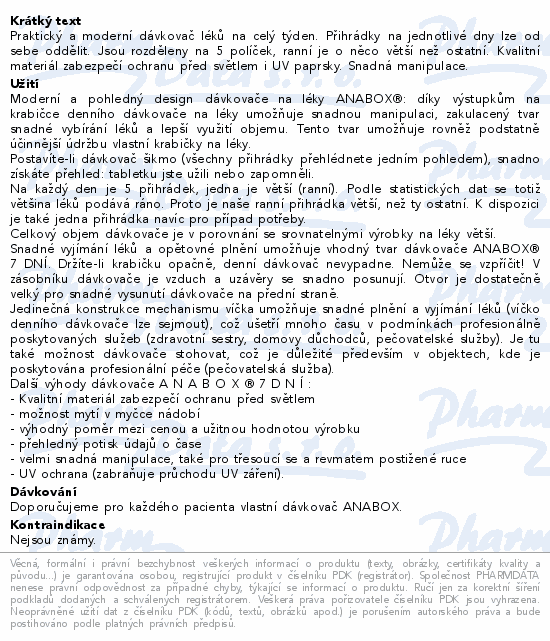 Praktický a moderní dávkovač léků na celý týden. Přihrádky na jednotlivé dny lze od sebe oddělit. Jsou rozděleny na 5 políček, ranní je o něco větší než ostatní. Kvalitní materiál zabezpečí ochranu před světlem i UV paprsky. Snadná manipulace.