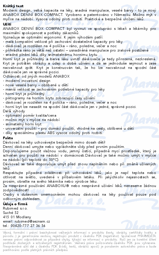 Moderní design, velká kapacita na léky, snadná manipulace, veselé barvy - to je nový ANABOX DENNÍ BOX COMPACT. Vyrobeno a patentováno v Německu. Možno mýt v myčce na nádobí. Vysoce odolný proti rozbití. Praktické a bezpečné uložení léků.
