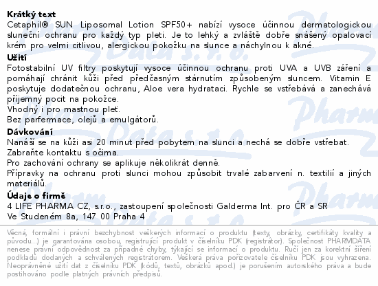 Cetaphil® SUN Liposomal Lotion SPF50+ nabízí vysoce účinnou dermatologickou sluneční ochranu pro každý typ pleti. Je to lehký a zvláště dobře snášený opalovací krém pro velmi citlivou, alergickou pokožku na slunce a náchylnou k akné.
