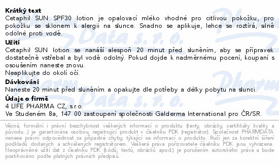 Cetaphil SUN SPF30 lotion je opalovací mléko vhodné pro citlivou pokožku, pro pokožku se sklonem k alergii na slunce. Snadno se aplikuje, lehce se roztírá, silně odolné proti vodě.