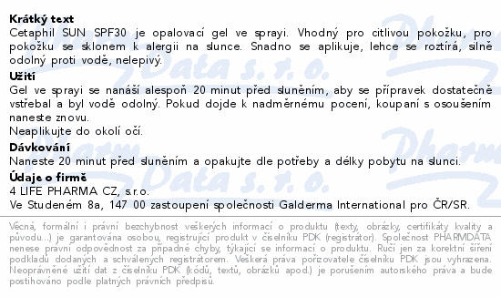 Cetaphil SUN SPF30 je opalovací gel ve sprayi. Vhodný pro citlivou pokožku, pro pokožku se sklonem k alergii na slunce. Snadno se aplikuje, lehce se roztírá, silně odolný proti vodě, nelepivý.