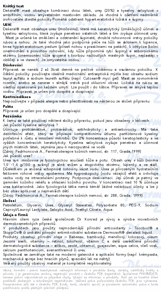 Dekeral® mast obsahuje kombinaci dvou látek, urey (20%) a kyseliny salicylové v ambifilním, vodou smývatelném masťovém základu. Je vhodná k ošetření nadměrně zrohovatělé ztvrdlé pokožky.Pomáhá odstranit hyperkeratotická ložiska a šupiny.