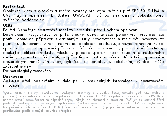 Opalovací krém s vysokým stupněm ochrany pro velmi světlou pleť SPF 50. S UVA a UVB filtry a vitamínem E. Systém UVA/UVB filtrů pomáhá chránit pokožku před spálením. Voděodolný .
