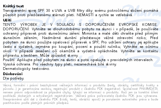 Transparentní sprej SPF 30 s UVA a UVB filtry díky svému pokročilému složení pomáhá působit proti předčasnému stárnutí pleti. NEMASTÍ a rychle se vstřebává.