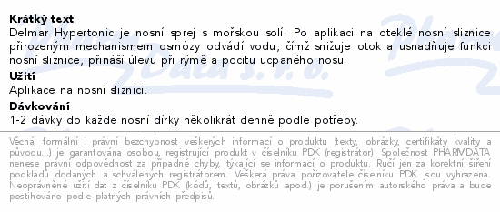 Delmar Hypertonic je nosní sprej s mořskou solí. Po aplikaci na oteklé nosní sliznice přirozeným mechanismem osmózy odvádí vodu, čímž snižuje otok a usnadňuje funkci nosní sliznice, přináší úlevu při rýmě a pocitu ucpaného nosu.