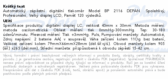 Automatický zápěstní digitální tlakoměr Model BP 2116 DEPAN. Spolehlivý, Profesionální, Velký displej LCD, Paměť 120 výsledků.