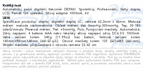 Automatický pažní digitální tlakoměr DEPAN. Spolehlivý, Profesionální, Velký displej LCD, Paměť 120 výsledků. Síťový adapter 1000mA, 6V.