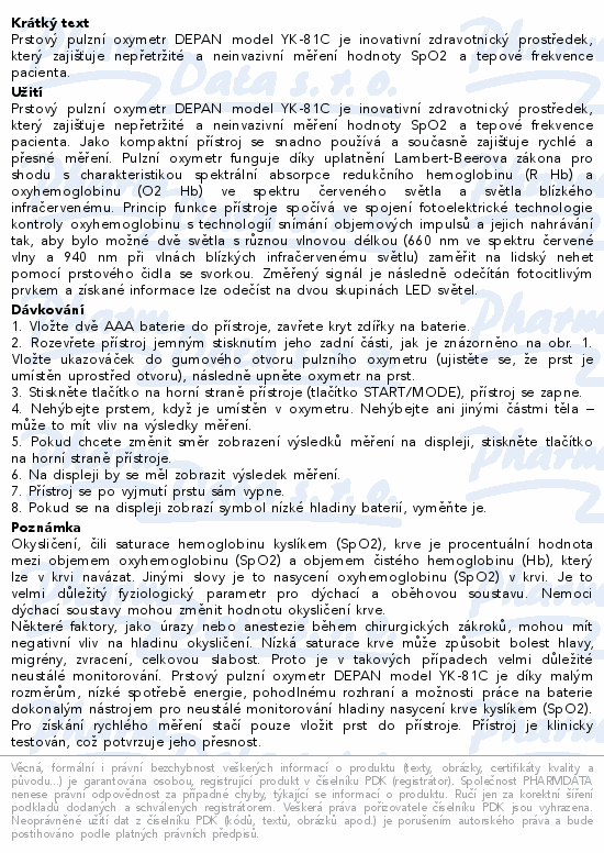 Prstový pulzní oxymetr DEPAN model YK-81C je inovativní zdravotnický prostředek, který zajišťuje nepřetržité a neinvazivní měření hodnoty SpO2 a tepové frekvence pacienta. Jako kompaktní přístroj se snadno používá a současně zajišťuje rychlé a přesné měření.