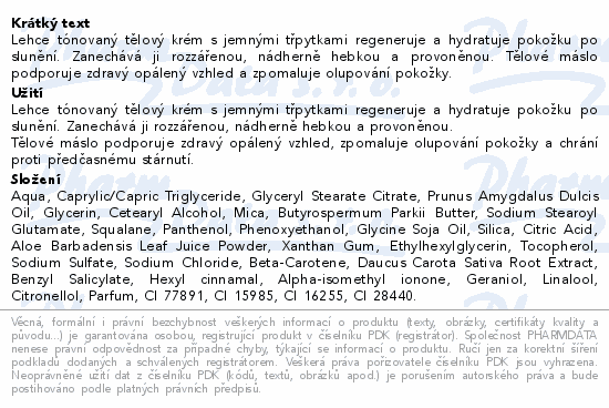 Lehce tónovaný tělový krém s jemnými třpytkami regeneruje a hydratuje pokožku po slunění. Zanechává ji rozzářenou, nádherně hebkou a provoněnou. Tělové máslo podporuje zdravý opálený vzhled a zpomaluje olupování pokožky.
