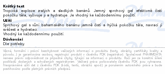 Tropická exploze zralých a sladkých banánů. Jemný sprchový gel efektivně čistí pokožku těla, vyživuje ji a hydratuje. Je vhodný ke každodennímu použití.