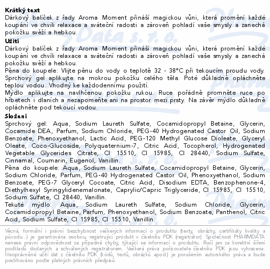 Dárkový balíček z řady Aroma Moment přináší magickou vůni, která promění každé koupání ve chvíli relaxace a sváteční radosti a zároveň pohladí vaše smysly a zanechá pokožku svěží a hebkou.