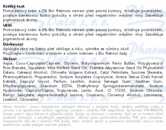 Protivráskový krém s 2% Bio Retinolu navrací pleti pevné kontury, zklidňuje podráždění, posiluje bariérovou funkci pokožky a chrání před negativními vnějšími vlivy. Zesvětluje pigmentové skvrny.