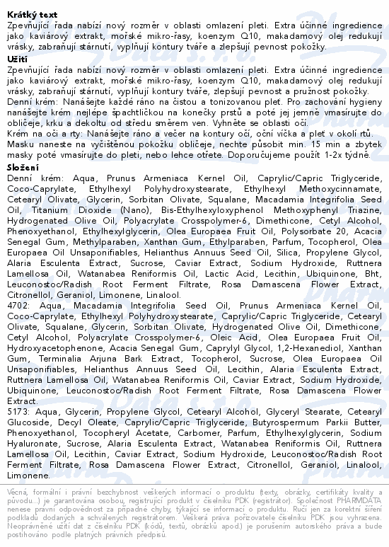 Zpevňující řada nabízí nový rozměr v oblasti omlazení pleti. Extra účinné ingredience jako kaviárový extrakt, mořské mikro-řasy, koenzym Q10, makadamový olej redukují vrásky, zabraňují stárnutí, vyplňují kontury tváře a zlepšují pevnost pokožky.