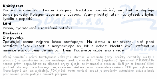 Podporuje okamžitou tvorbu kolagenu. Redukuje podráždění, zarudnutí a zlepšuje tonus pokožky. Kolagen živočišného původu. Výživný koktejl vitamínů, výtažek z bylin, kyselin a peptidů.