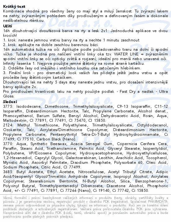 Kombinace vhodná pro všechny ženy co mají styl a milují ženskost. Tu zvýrazní lakem na nehty, zvýrazněným pohledem díky prodlouženým a definovaným řasám a dokonale neslíbatelnou rtěnkou.