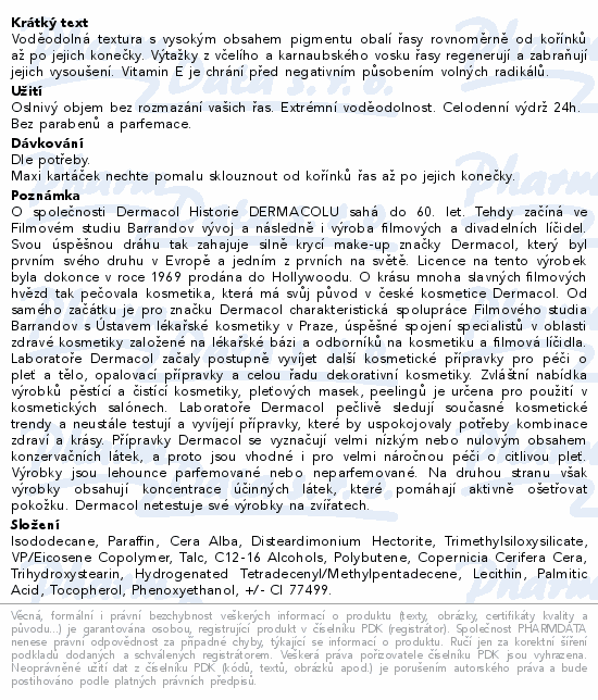 Voděodolná textura s vysokým obsahem pigmentu obalí řasy rovnoměrně od kořínků až po jejich konečky. Výtažky z včelího a karnaubského vosku řasy regenerují a zabraňují jejich vysoušení. Vitamin E je chrání před negativním působením volných radikálů.