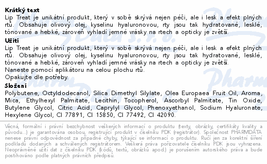Lip Treat je unikátní produkt, který v sobě skrývá nejen péči, ale i lesk a efekt plných rtů. Obsahuje olivový olej, kyselinu hyaluronovou, rty jsou tak hydratované, lesklé, tónované a hebké, zároveň vyhladí jemné vrásky na rtech a opticky je zvětší.
