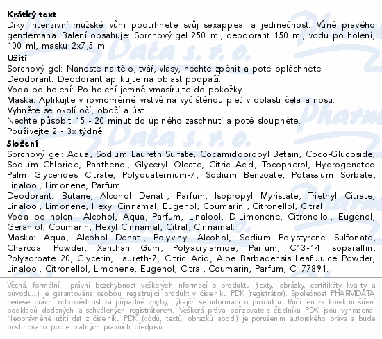 Díky intenzivní mužské vůni podtrhnete svůj sexappeal a jedinečnost. Vůně pravého gentlemana. Balení obsahuje: Sprchový gel 250 ml, deodorant 150 ml, vodu po holení, 100 ml, masku 2x7,5 ml.