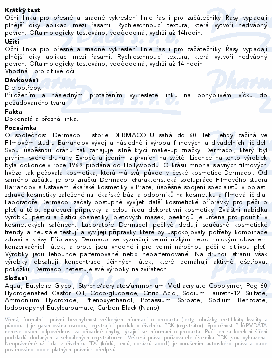 Oční linka pro přesné a snadné vykreslení linie řas i pro začátečníky. Řasy vypadají plnější díky aplikaci mezi řasami. Rychleschnoucí textura, která vytvoří hedvábný povrch. Oftalmologicky testováno, voděodolná, vydrží až 14hodin.