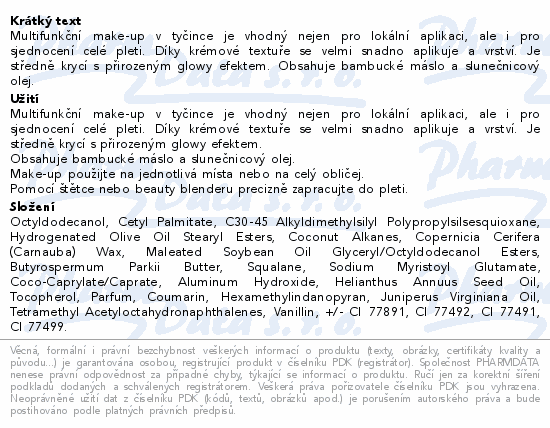 Multifunkční make-up v tyčince je vhodný nejen pro lokální aplikaci, ale i pro sjednocení celé pleti. Díky krémové textuře se velmi snadno aplikuje a vrství. Je středně krycí s přirozeným glowy efektem. Obsahuje bambucké máslo a slunečnicový olej.