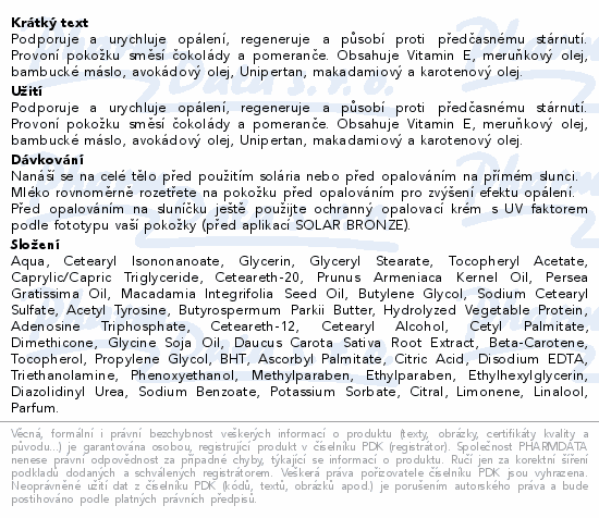 Podporuje a urychluje opálení, regeneruje a působí proti předčasnému stárnutí. Provoní pokožku směsí čokolády a pomeranče. Obsahuje Vitamin E, meruňkový olej, bambucké máslo, avokádový olej, Unipertan, makadamiový a karotenový olej.
